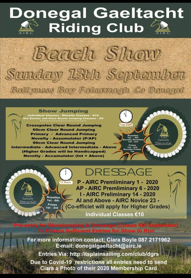 On Sunday many of our members are heading to Riverview Equestrian in Ballybofey to enjoy a sociable local show. Being organised by Anne Chambers this looks like being a great way to end the summer holidays and should be a great practice run for the Donegal Gaeltachts Riding Club show two weeks later. That event is definitely one of the standout shows of the nations calendar as it is held in Ballyness Bay, one of the most spectacular showgrounds imaginable. It certainly qualifies as the most spacious showground in the country. What other venue boasts a freely available sea-water spa?! Entries for this show are now open and plans to camp the night before are very tempting…